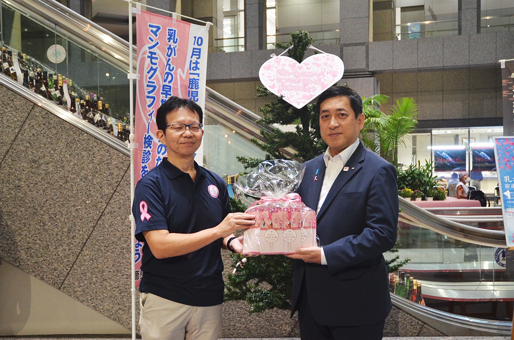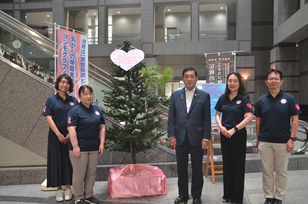 10月1日(水)に県庁1階にピンクツリーが設置され、県健康増進課、県民総合保健センター、NPO法人 ピンクリボンかごしまが一堂に会し、ピンクのリボンを結びました。