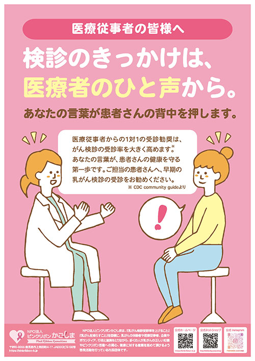 ピンクリボンかごしまでは医療従事者の皆様から担当の患者さんへ、乳がん検診勧奨を促すポスターを配布しております。