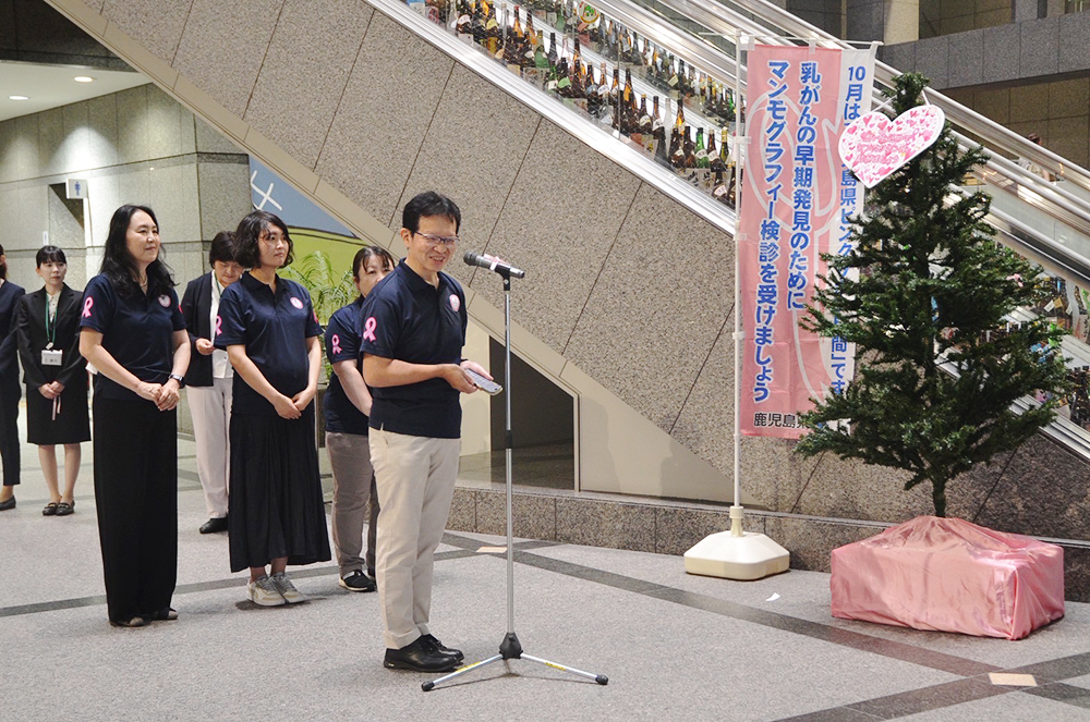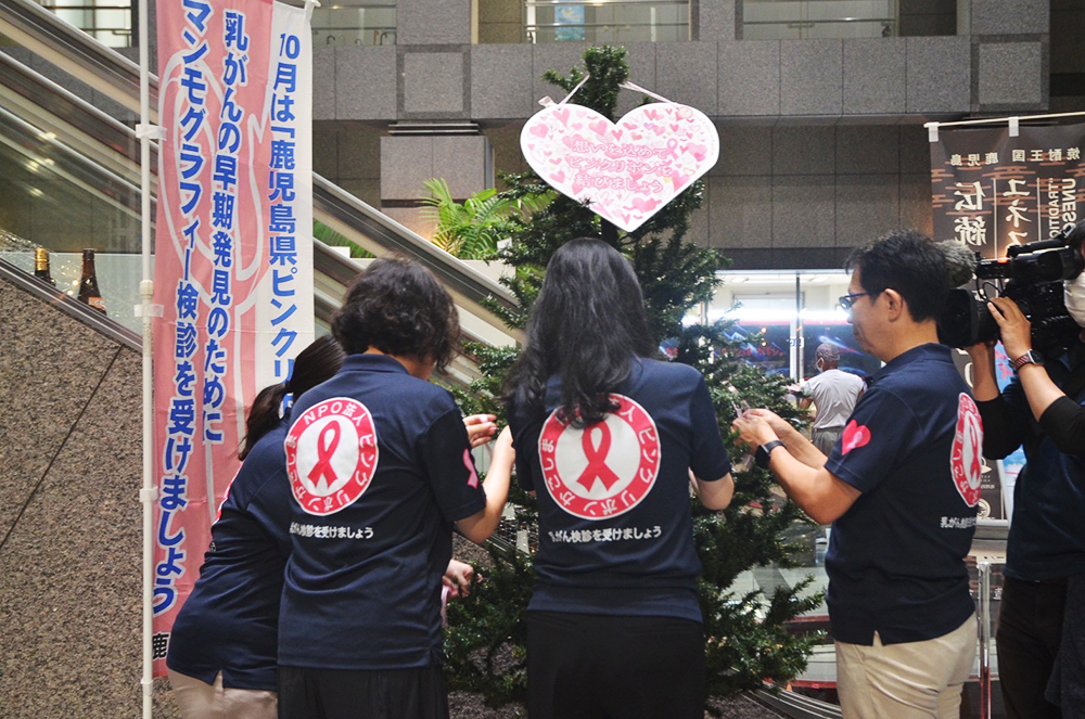 10月1日(水)に県庁1階にピンクツリーが設置され、県健康増進課、県民総合保健センター、NPO法人 ピンクリボンかごしまが一堂に会し、ピンクのリボンを結びました。
